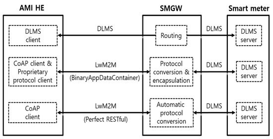Since the LwM2M protocol is adopted between the AMI 2.0 head-end system and SMGW, KEPCO has unified the protocols for remote device management and remote metering into the LwM2M protocol. Meanwhile, to provide backward comparability with the existing proprietary protocol, KEPCO temporarily uses an object ID = 19 (BinaryAppDataContainer)-based encapsulation method defined in the LwM2M protocol [10,35].