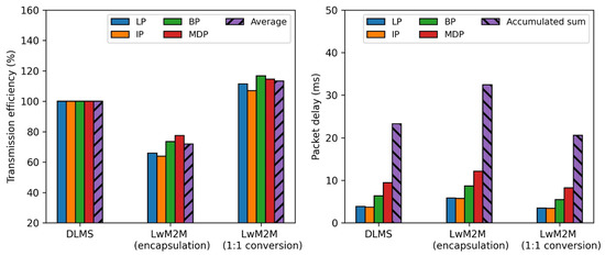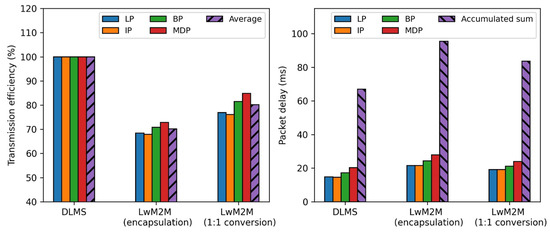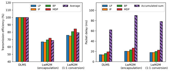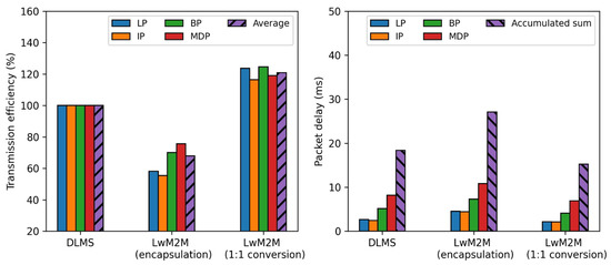 Figure 11 summarizes the performance metrics of authenticated encryption with the session establishment for the three different approaches. The result shows that the proposed approach improves the packet transmission efficiency, on average, by 9.9%p and the packet delay, in total, by 11.86 ms, compared to the encapsulation approach of the LwM2M protocol, whereas it deteriorates the packet transmission efficiency, on average, by 19.8%p and the packet delay, in total, by 16.58 ms, compared to the full DLMS protocol approach.