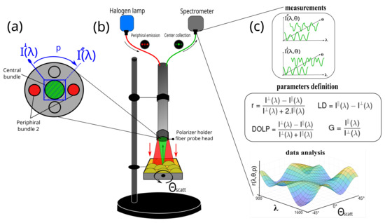 For decades, numerous spectroscopic works have studied the scattering and absorption properties in in vivo tissues [2,3]. Practically, most of the recent high-performance devices are based on a non-linear process analysis such as Raman scattering or IR absorption [4,5]. Their limitations come from the high costs of the instruments and the special training needed for the operators due to bulky setups that force the operator to manage every aspect of the technique [6]. Among these methods, diffuse reflectance spectroscopy (DRS) or elastic scattering spectroscopy [7,8,9,10] has emerged as a powerful tool offering the possibility of real-time tissue differentiation [11,12]. It is achieved using a broadband white light sent through a fiber into the tissue using inexpensive optical components. After interacting with the tissue, the backscattered light is collected and analyzed using a spectrometer. In such a manner, regions of interest (ROIs) can be deciphered in the reflected spectrum that is highly specific for the absorption and scattering characteristics of the individual tissue properties. Essentially, the heterogeneities inside the sample produce multiple scattering, whereas the absorption is predominantly linked to hemoglobin or water through the tissue [13]. This method has been successfully applied to numerous kinds of tissues, such as skin [14], breast [15], or lung [16] and to molecular concentration monitoring [17]. More particularly, DRS has been mostly beneficial in the medical field toward fast tissue diagnosis in a guided surgery for the near-IR [18], which explains that the most recent advances have allowed for the fast implementation of new solutions such as optimizing optical heads with a polarization modality [19], using multiple coherent light sources simultaneously for diffuse and autofluorescence acquisition in imaging mode [20], and the analysis which is post-processed with machine learning approach [21]. However, analyzing a single spectrum from the reflectance light/matter interaction is not sensitive enough to understand the complex 3D organization of a thick biological sample. On the one hand, the distribution of the light scattering angle erases cumulative factors such as (1) the roughness of the sample surface and (2) the molecular species under illumination [22]. More particularly, the scattering light is overly sensitive to the difference in size or the ratio of the refractive index between scatters and the molecular content at the sub-micrometric scale [23]. On the other hand, the tissue orientation could drastically modify the reflectance spectrum by considering linear polarized light illumination. Certainly, a pointed example could be taken from previous studies that mention the loss of polarization from the randomness induced by pathological tissues [24,25]. On the contrary, highly organized tissues such as muscles exhibit the preferential direction of the reflected light [26].