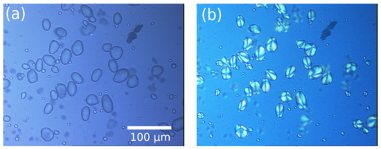 732 × 546 pixel images of starch granules from potato using a Leica microscope customized with tri-CCD Sony camera and Sarfus software. (a) White lamp wide-field image and (b) crossed polarization-resolved image.