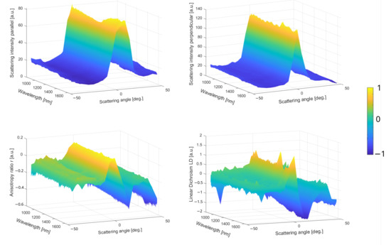 The raw data are reported in the top row of Figure 3 corresponding to the parallel and perpendicular spectra recorded in the function of the scattering angle provided by the optical setup reported in the Section 2. The sample is placed on a glass microscope slice; thus, no geometrical feature could contribute to any fluctuations in the scattering amplitude. In this case, the light emission is specular, i.e., forward light emission, which is confirmed by the Gaussian curves for both orthogonal polarization states in Figure 3 top. However, the magnitude difference between these two orthogonal scattering spectra, a factor of about 1.5, indicates a privileged light emission orientation as can be visualized in the images in Figure 2. This effect is induced by a preferential dipole transition excitation direction from the illuminated molecules, resulting in anisotropic off-axis polarization emission. Thereby, r and LD are shown in the bottom row of Figure 3 proving that the sign and magnitude are angular-dependent on the sample orientation since these two parameters are non-null. The LD scattering pattern for chiral molecules exhibits two antisymmetric amplitudes related to forward emission, and is consistent with the Kramers–Kronig dispersion relation [35]. The r function is almost negative and decreases drastically at a high scattering angle, caused by the specular reflection on the plane surface. The LD function is symmetrical with two identical absolute magnitudes in the positive and negative signs. Usually, this pattern is well-observed for the visible wavelength range and LD becomes negligible in the NIR. However, the curve is still Kramers–Kronig-consistent in the function of the angle due to the conservation of the averaged macroscopic light emission that implies no change in the complex dielectric function. In order to simplify, DOLP and G are not presented for this sample, are assumed to be almost inconsequential for such molecules, and exhibit a preferential circular polarized light [36]. In summary, Figure 3 plots express two distinct physical effects from the same illumination dominated by (1) the Mie scattering in Figure 3 top and (2) the polarized light in Figure 3 bottom. More precisely, the top Figure 3 plots indicate the averaged size of the scatters, and comparing both parallel and perpendicular spectral intensities is interesting to obtain a general idea on how the average dipolar orientation is. On the contrary, the bottom Figure 3 plots provide a deeper understanding of the physical or mechanical properties of a material in different spatial directions. Thus, Figure 3 bottom plots could allow for the localization of the chiral molecules hidden in a mixed/bulky environment in a label-free way or give access to different structural order and orientation.