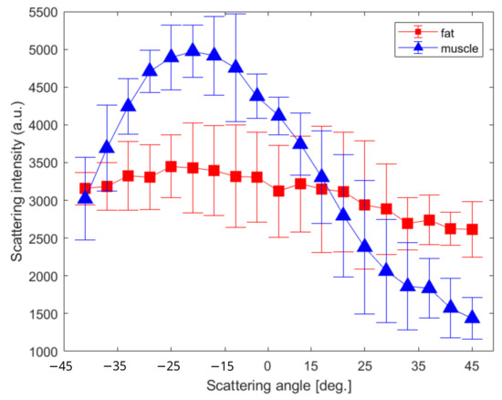 In the blue plot, we can see that the single muscular tissues exhibit a stronger specular behavior compared to the connective/muscular tissues. This could be explained by the Mie theory which mentions an emission diagram linked to the type with a relative refractive index and the size of the scatters [37]. Thus, the unique molecular specie under illumination induces a straightforward reflection with weaker magnitudes at higher scattering angles. Conversely in the red plot, a mixture of different types of scatters that formed the mixed type of tissue (composed of muscle, fat, and epithelial), coupled with a multi-scattering process, produce a stochastic light reflectance indifferently at any scattering angles [38].