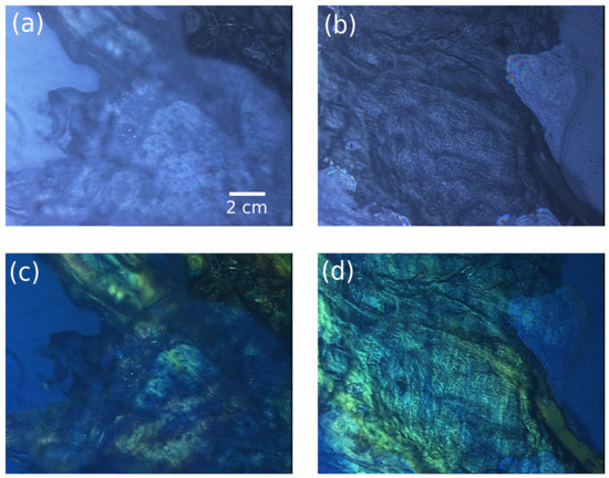 Figure 5a,c is related to the connective/muscular region and Figure 5b,d corresponds to the tendon of the leg. The colors observed in the polarization images of Figure 5b,d are induced by the dephasing effect of thick and scattered tissues on the polarized light, highlighting specific tissue or biological arrangement. This modality is a powerful tool for optical microscopy since it provides label-free contrasts of the sample organization and drastically improves the quantitative information available from the light–matter interaction [39]. In the images reported in Figure 5, the mixed tissue region (fat, epithelium, and muscle) in Figure 5a,c appears disorganized in all 3D volumes, which explains the blurred area in the images and their bulky aspect. On the contrary, the tendon region in Figure 5b,d appears more organized and well-structured corresponding to the actin–myosin complex that forms the retractable muscle.