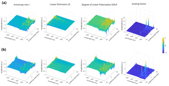 r () is widely used as an indicator of molecular size or diffusion in fluorescence spectroscopy and expresses the preferential excitation of molecules with transition dipoles oriented along a particular polarization direction [28]. LD () corresponds to the difference of two absorption spectra between two orthogonal linear polarizations and is linked to the macroscopic averaged orientation of the molecules [29]. DOLP () provides information on the tissue’s ability to reflect linear polarization. The grating factor G () is an instrumental preference of the emission optics for rather than .