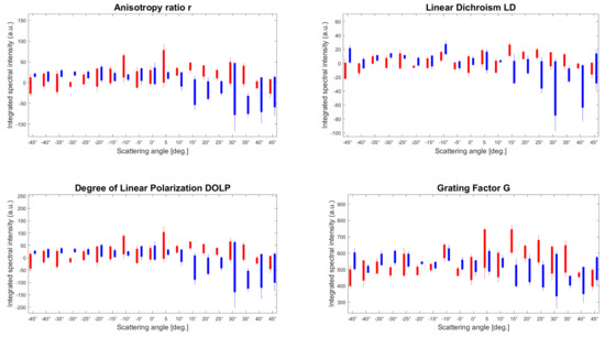To look more closely at the statistical dispersion of the parameter amplitudes and understand the influence of the 3D illumination location, Figure 7 reports the integrated spectra in the function of the scattering angle over all of the three ROIs for the connective/muscular tissues (red) and tendon (blue). For clarity reasons, each bar corresponds to the three integrated spectral values by area related to the scattering angle. In such a manner, the contribution of the negligible magnitudes observed in Figure 6 at lower wavelengths can be silenced. Additionally, such statistical analysis improves the sensitivity of the multiparametric approach and quantifies the degree of randomness of the macroscopic biological organization.