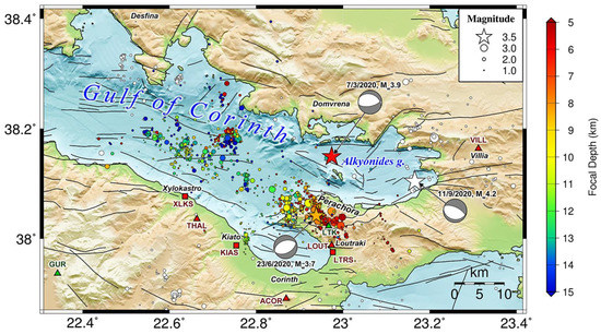 Area of study in the EGoC. Relocated seismicity for the period January 2020–June 2021, from the manual catalog of this study (CAT1), is presented with colors corresponding to the focal depth. Epicenters in the broader area with a white color are from the same period but not included in the catalog of this study. Events with magnitude M ≥ 3.5 are drawn with stars. Seismological (triangles) and accelerometric (squares) stations, belonging to HA ([46]; red) and HP ([47]; green) networks of the HUSN, which were operational during the study period, are also displayed on the map. Focal mechanisms of major events (Mw ≥ 3.7) are from the databases of the NKUA-SL, GI-NOA, and ISC (see also [29]). Fault lines are from the NOAFaults v4.0 database [48,49].