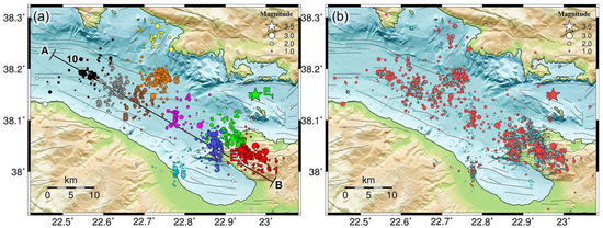 Earthquake behavior often manifests in patterns that are chiefly distinguished as mainshock–aftershock sequences and swarms. In the former case, a major earthquake leads the sequence, causing slippage of a relatively large fault surface that, depending on its magnitude, redistributes stress, which, in turn, triggers aftershocks to neighboring fault patches. Secondary sequences may then be triggered by major aftershocks, which are not expected to be much larger than approximately one order of magnitude less than the mainshock. There are, however, exceptions, with follow-up earthquakes having a magnitude comparable to that of the mainshock, as in several cases of earthquake “doublets”, which have been observed during the past decades in Greece [1,2,3]. In earthquake swarms, meanwhile, by definition, there is no single major event that could be characterized as a mainshock, leading the sequence. Very often, the larger events occur mid-sequence, rather than at the beginning [4], a characteristic that is exploited to distinguish between mainshock–aftershock sequences and swarms based on the skewness and kurtosis of their seismic moment release history [5]. Furthermore, swarms usually evolve in multiple stages, with bursts of earthquakes, usually concentrated in spatial clusters, either activating neighboring faults or re-activating the same fault patches [6,7]. The latter is related to the concept of repeating earthquakes, or multiplets, i.e., events with similar earthquake source parameters, producing nearly identical waveform recordings [8]. The spatiotemporal evolution of earthquake swarms usually exhibits migration patterns, with seismicity gradually spreading radially, or even unilaterally, from an origin through the fault network [9].