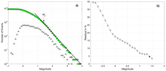 The catalog of multi-channel detections, CAT3, contains a total of 8527 events with a magnitude estimate (either ML for templates or relative magnitude for detections). The minimum magnitude of CAT3 is estimated at −0.8. The FMD for CAT3 is shown in Figure 5a. The number of events keeps increasing, down to magnitude 0.5. However, the absolute value of the slope between 0.5 and 1.4 appears to be lower than for magnitudes above 1.4. This could be caused by a real deficit of detected events in the catalog, i.e., events that could not be detected because they were dissimilar from all used templates, or not similar enough for an adequate number of channels. It could also be due to a real difference in the b-value for events of smaller magnitudes, indicating different scaling in the distribution of magnitudes, reflecting differences in the distribution of rupture lengths or areas. A simpler explanation is that there is a difference in the way that the magnitude is determined between the templates and the detections, so a bias in the measurements of relative magnitude is to be expected, which could be dependent on the correlation coefficient [55]. For the templates of CAT1, the ML magnitude is calculated, taking into account instrument correction and the peak amplitude of the waveforms. Meanwhile, for the detections of CAT3, a relative magnitude is estimated, considering the standard deviation ratio and signal-to-noise ratio between the traces of the templates and detections (Equation (1)). This type of magnitude will likely have different scaling from ML, which could explain the different slope in the FMD. Nevertheless, the MaxC method and the GoF test for 90% residuals (Figure 5b) provide an Mc of 0.9 for CAT3. The Mc is higher for 95% residuals, equal to 1.4 (Figure 5b). The latter value of Mc = 1.4 is preferred as when setting the minimum magnitude to 1.4 for the maximum likelihood estimation of the a and b parameters, the G–R relation has a better fit to the observed distribution (Figure 5a). The a and b parameters are estimated as a = 4.58 ± 0.13 and b = 1.17 ± 0.04, which are almost identical to those calculated for CAT1.