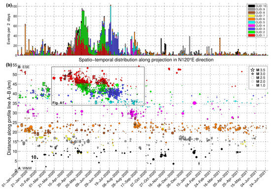 (a) Stacked histogram of the number of events per two days for events of CAT3 with magnitude M ≥ 0.5. (b) Spatiotemporal projection of the epicenters along the WNW–ESE-oriented (N120°E) A–B profile of Figure 3a. Colors and numbers (panel (b)) correspond to the spatial groups of Figure 3a (CLID = Cluster ID). Events with magnitude M ≥ 3.0 are represented by stars. The major events E1 and E2 are marked in panel (b). The rectangle in panel (b) shows the boundaries of the close-up presented in Figure A1 of the Appendix A. Figure A2 of the Appendix A shows the respective cumulative number of events per spatial group.