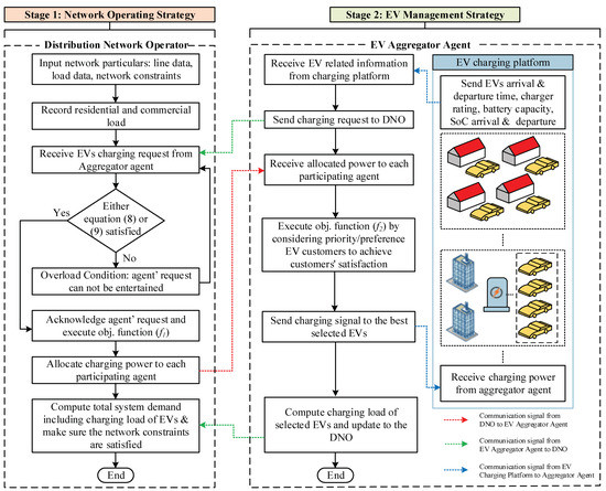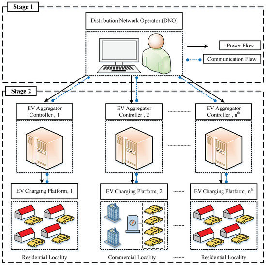 An EV has various charging facilities to charge its battery. These facilities include residential, workplace, commercial and public charging supply points. Each charging supply point has a specific charging level. For example, home-based and workplace charging facilities operate at level-I or level-II. They are classified based on electrical parameters, such as current, voltage and power rating. The level-I charging standard employs single-phase 115 VAC/15 A or 230 VAC/6 A and can supply 1.5 kW of power to the EV battery [20]. The 230 VAC/30 A and 7 kW power rating standards are part of level-II charging and are commonly used at home and public charging stations [20]. The level-III charging mode is a comparatively fast charging solution and is the most suitable for commercial vehicles [20]. In many countries, private EVs dominate the transport sector, and approximately 50–80% of EV customers prefer overnight charging at home, followed by 15–20% of EV customers who use workplace charging as a secondary option [7,8]. Moreover, private EVs have short travel times and long idle or parking times [19]. Based on these facts, we have developed a charging scenario for private EVs and managed their day and night charging activities via EV aggregators using workplace and residential charging platforms with level-II charging infrastructure. Due to the uncertainty of the arrival and departure of EVs and their increasing penetration into the power grid, it is difficult for the grid operator to maintain grid operational efficiency and achieve the load satisfaction of every individual EV customer in a shorter lead time. It is essential in real-world problems to achieve the desired objectives with reasonable computational effort [21]. If the problem is divided into two stages instead of solved as one unit, we can achieve our objectives and shorten the algorithm execution time. In the first stage, the DNO receives the charging load demand from the EV aggregators and allocates the appropriate power to each participating EV aggregator while minimizing grid power losses and voltage deviations. In contrast, the charging satisfaction of individual EV customers is ensured in the second stage of the proposed scheme.