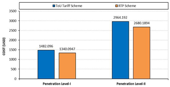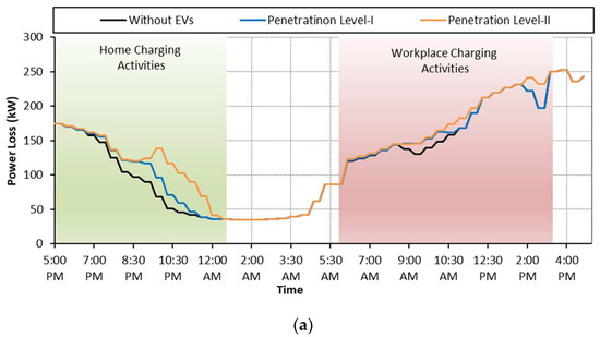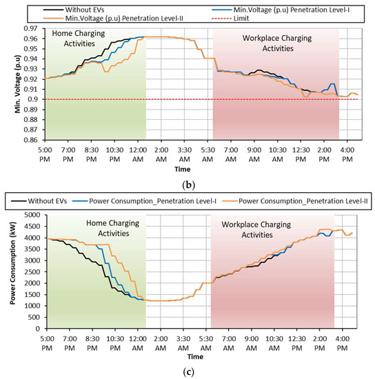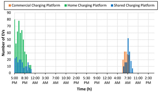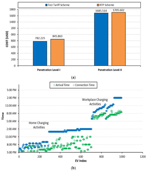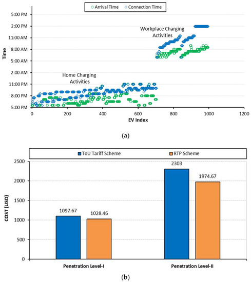 Using smart grid communication facilities, EV charging activities can be coordinated, and problems associated with unregulated handling can be minimized while meeting load demand. However, it is challenging for grid operators to manage EV charging activities simultaneously with optimal grid operation. To satisfy the charging requirements of EV users without deteriorating the performance of the electric grid, it is essential to distribute the control of charging activities among the multiple charging agents known as “EV Charging Aggregator Agents”. This approach reduces the search space and provides quality solutions as each aggregator agent will supervise the charging activities of its region only. It will have no concerns with the charging activities in the neighborhood. This way, a hierarchy control is required, which could simultaneously handle the network operation and effectively manage EVs’ charging activities. Furthermore, EV charging is a random process that can take place either at home, at charging stations or even at the workplace. Approximately 50–80% of EV customers prefer overnight charging at home, followed by 15–20% who use workplace charging as a secondary option [7,8]. Previous research work related to EV charging either focused on home-based charging or considered commercial/workplace charging. Generally, the EVs’ charging demand and their impact on the electricity network change regarding location and time [9]. Therefore, it is necessary to investigate the impact of EV charging considering home and workplace platforms with day and night charging schedules to create a useful plan based on customers’ preferences.