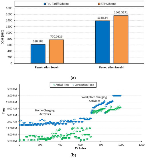 - Various indices for power loss, voltage profile, charging cost and waiting time are devised for the coordinated charging operation of EVs, and the customers’ charging satisfaction is investigated with the time of use (ToU) and real-time pricing (RTP);
