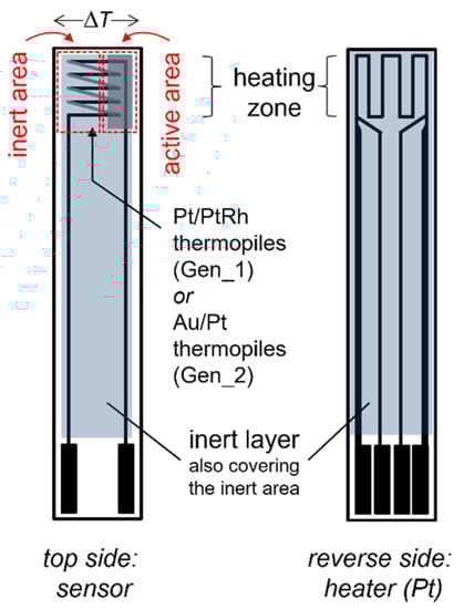 As the thermal conductivity of the substrate material may reduce the temperature difference between both areas on the sensor tip, low-temperature co-fired ceramics (LTCC) may be used as a sensor substrate to enhance the sensitivity significantly, owing to their lower thermal conductivity (ca. 2.5 W/mK, instead of 9 to 10 W/mK for alumina for 400 to 600 °C [20]). Unfortunately, the glass ceramic-based LTCC materials offer lower mechanical strength, which makes handling them difficult. It turned out that a combination of alumina with laminated glass-ceramic layers on the front side as substrate are a good compromise [21]. We used this technology for the Gen_2 sensors, in contrast to “blank” alumina substrates for the Gen_1 sensors.