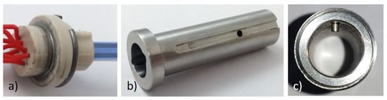 As mentioned before, the sensor periphery affects the access of the analytes to the functional layer. In our investigations, we worked with a special modular housing concept. Here, the ceramic sensing element is enclosed by two half-shells made of high-temperature, stable plastics (PEEK). Holes and notches are integrated in these half-shells to attach integrated hookup wires to the positions of the contact pads of the element. A clamping ring holds both half-shells together (Figure 2a). The sensor substrate has the only connection point with the housing at the location of the contact pads. An appropriate adapter (which might include a protective cap (Figure 2b)) is placed over the sensor element. The shape of the assembled half-shells precisely matches the adapter to hold the sensing element in a well-defined position relative to the cap. The cap comprises a nut, so that the installation position in the flange (Figure 2c) that is welded to the flue pipe in the chimney can be ensured with a corresponding pin. Such modular housing allows, amongst others, the rapid exchange of the sensing element and the use of different protective caps.