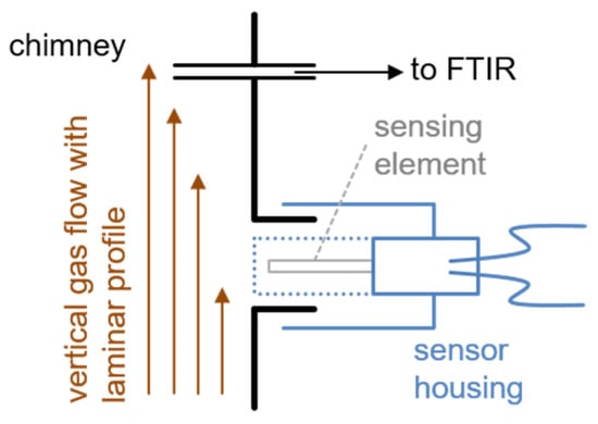 Scheme of the sensor mounting position in real exhaust measurements on the fringe of a vertical chimney. The tip of the sensing element is slightly recessed and not directly exposed to the gas flow.