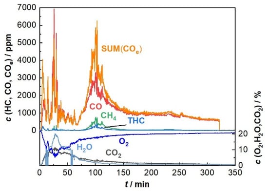 Typical emissions during charge combustion of a wood-log-fueled fireplace (HKD7, Brunner) measured by FTIR (only the main components such as CO, C2H4, CH4 and other hydrocarbons; THC plus CO2 and H2O are displayed). The ROC is logged using a commercial lambda probe (LSU 4.9, Bosch) and SUM(COe) was calculated according to Equation (1).