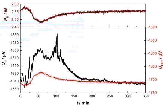 A look at the heater power PH might provide an explanation for this behavior. PH decreases strongly during this time span and recovers until the end of the experiment. These findings coincide with the temperature changes in the exhaust and estimated temperature changes in the exhaust tube and sensor housing. Moreover, we see a correlation between the heater power and sensor signal. It is assumed that not only the catalytically caused temperature difference is affected here by secondary effects, but the sensors offset voltage changes too. Therefore, in the following considerations, the influence of these secondary effects induced by ambient temperature changes in the sensor’s offset voltage is discussed.