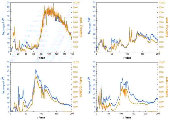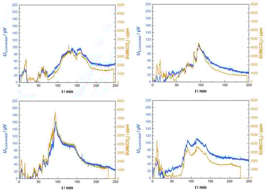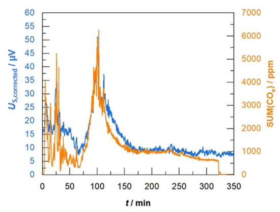 In the real exhaust measurements of wood log fueled firing experiments, expectably, the sensor signal must be corrected here also because there are still changes in the atmosphere with regard to the temperature of the exhaust tube and housing during the start, which could have affected the sensor signal.