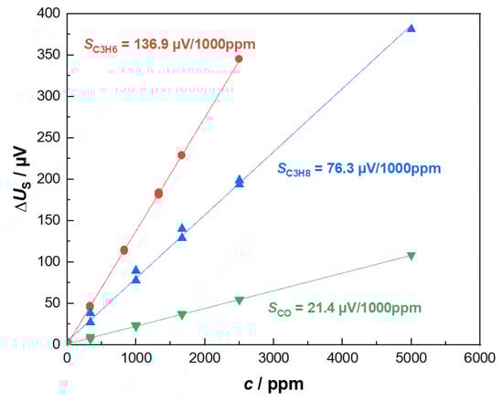 Different sensitivities toward different gas species are reflected in different slopes of such lab measurements. They depend not only on the caloric values of the gas molecules, which are catalytically converted at the sensors functional layer, but also, diffusivity and reactivity play a role in the transport limited process of the target gas reaction with oxygen, as already discussed for a caloric sensor chip [16], which is based on similar gas reaction processes. For instance, unsaturated hydrocarbons (such as, e.g., propene, C3H6) lead to a much larger response than its corresponding saturated species (propane, C3H8) does. For propane, the slope is just a little more than two times steeper than the slope of CO, and propene causes an effect that is around six times larger than the CO response is. However, in case of stable methane (CH4) exposure, the sensitivity is only half that of CO. More details on that are given in [22,24].