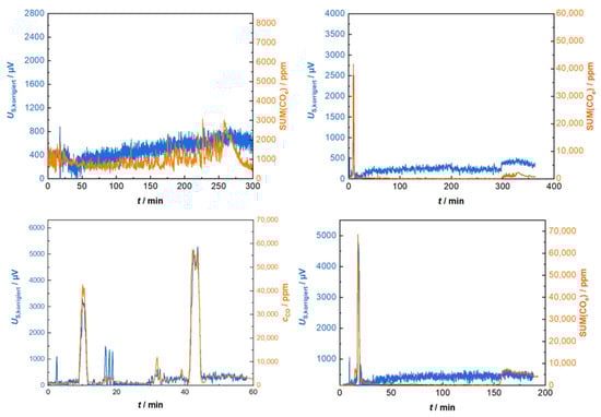 Therefore, again, we identified three points in time with similar gas conditions (vanishing amounts of reducing gases measured by FTIR), but at different heater power values. A linear relationship was derived again. This correction was then applied to all other measurements from Gen_2 of subsequent combustion cycles. Exemplarily, Figure 10 shows four different sets of sensor signals and FTIR data in direct comparison. The course of the corrected sensor signals and the corresponding COe data agree quite well, and the sensor’s responses reflected in the concentration peaks correspond nicely. Mostly, discrepancies occur in the beginning, where large variations in the flue gas flow, humidity changes and stronger variations in the heater power are unavoidable.
