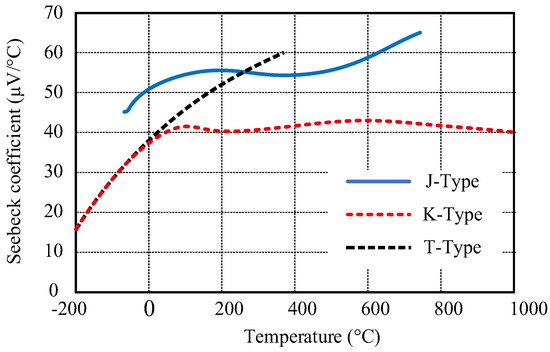 Temperature-dependent sensitivity change of three types of thermocouples (adopted from [36]). K- and J-type thermocouples were chosen for the tests in the study.