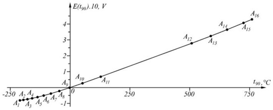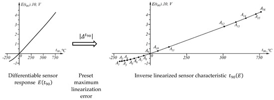 The proposed generalized approach was also tested in the linearization of the inverse sensor characteristic of Type J thermocouples [39]. When the maximum approximation error is set in interval , the inverse sensor characteristic (representing a broken line) is described by 16 points (Figure 11).