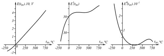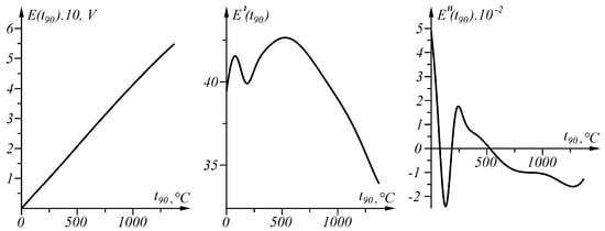 Functions E(t_90), its first derivative E’ (t_90) and second derivative E″ (t_90) in interval t_90 ∈ [0, 1372 °C].