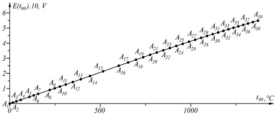 The proposed generalized approach was tested in the linearization of the inverse sensor characteristic of Type K thermocouples [37]. When the maximum approximation error is set in interval , the inverse sensory characteristic (representing a broken line) is described by 39 points (Figure 6).