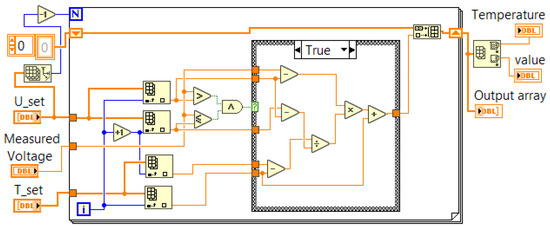 The algorithm was also implemented as a virtual instrument in the LabVIEW programming environment (see Figure 8). The version used by the authors to validate the proposed virtual instrument was LabVIEW 2012, but it would work on any newer version. The input parameters were the generated voltage from the thermocouple (Measured Voltage) and the two arrays with the stored coordinate values for each point (U_set and T_set). The output parameters were the converted temperature and an array (output array) in which only one element will have a value other than the constant NaN, and this will be the converted temperature. For input voltages that are in the specified range, there will be only one case where the condition of the “case” structure will be “True”. This is the case where the temperature needs to be calculated. In all other cases, the element with the constant “NaN” is added to the “Output array”.