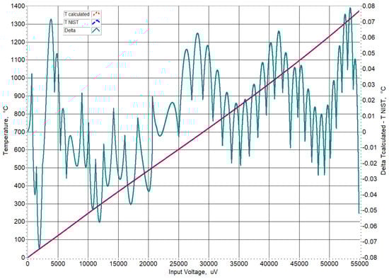To prove the correct operation of the developed virtual instrument, values in the range with step were fed to its input. Figure 9 shows the linearized output, the temperature calculated by approximate inverse functions giving temperature, , as a function of the thermoelectric voltage and the difference between them.