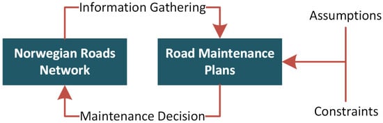 The fourth industrial revolution (Industry 4.0) strongly emphasizes the integration of physical and digital systems [,]. PdM-based road inspection is a novel and demanding concept to maintain the road’s infrastructure. A thematic diagram of PdM for roads is available in Figure 1. The information from the road network is required for the maintenance plans and to make maintenance decisions. The assumptions define the maintenance plans, while constraints restrict the scope of the plans. Road networks re vital in enabling ground transport; consequently, the roads are directly linked to a wide range of economic and social activities. Therefore, proposing maintenance plans for roads is crucial to preserve both the capacity and value of road assets.