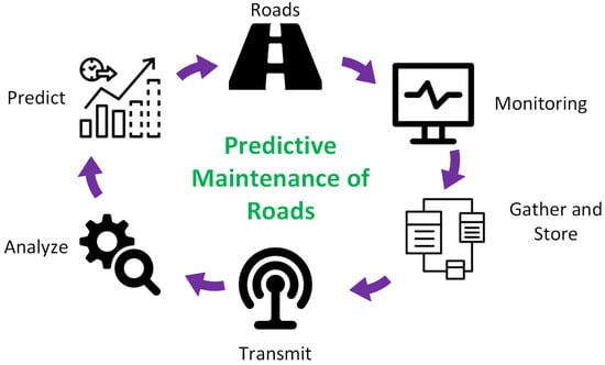 Recent technological advancements have made it feasible to conveniently monitor the road’s infrastructure using different cameras, recognizing the road conditions by detecting specific damage types to execute maintenance plans and decisions. A PdM-based framework for monitoring and detecting road cracks is presented in Figure 2.