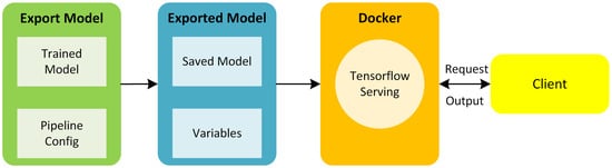 As seen in Figure 4, a trained model and its configuration file were exported into a saved model and a variables directory. Preferably, the trained model should be frozen, as this eliminates the meta-data and variables that are not necessary. Encapsulating the model in a single file is not as computationally intensive. However, using the NVIDIA docker makes it possible to utilize the GPU on the virtual machine. The serving image was built within Docker. Moreover, the exported model was committed to Docker. Finally, a TensorFlow model server was started to manage the model service. By running the model server, the model was accessible from the client’s scripts.