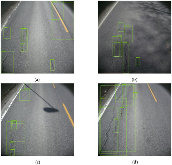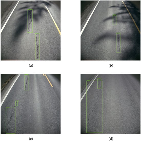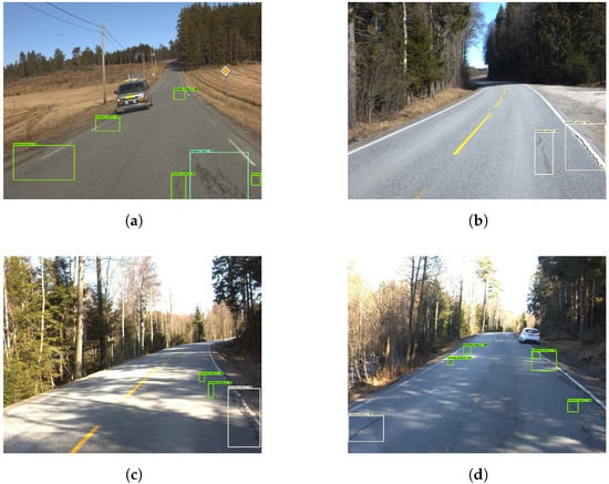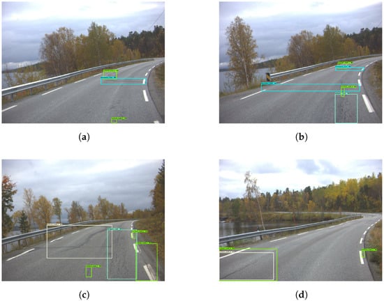 Figure 9 shows examples of good damage detection with the model. Figure 9a shows that the model correctly detects five vertical cracks, as well as one ‘alligator crack’. Figure 9b shows the model detecting two ‘vertical crack 2’ instances. Moreover, both Figure 9c,d show the model detecting ‘vertical crack 1’ and ‘vertical crack 2’, despite shadows covering parts of the roads.