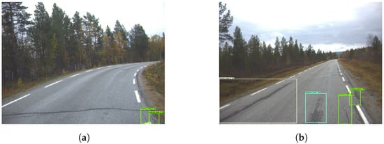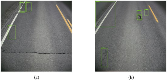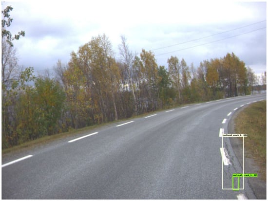 Figure 5 presents four examples, where the model correctly determined the presence of vertical cracks. It did, however, detect the same cracks several times. This resulted in a cluttered image filled with detection boxes. Given the low representation of other damages, the model struggled to detect them. Figure 6 provides insight into that specific problem. In Figure 6a, the horizontal crack is completely ignored. Figure 6b depicts a pothole that is mistakenly interpreted as a vertical crack.