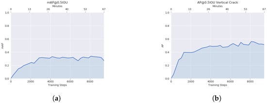 As can be seen in Figure 7a, the mAP convoluted at roughly 30%. Likewise, Figure 7b shows the average precision of ‘vertical crack’ detection to be slightly above 50%.