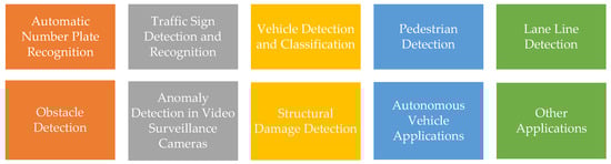 It is predicted that transportation systems will become smarter through the use of ML, big data analysis, and more powerful computing resources []. In the following sections, the studies in the literature on various CV applications in ITS that are listed in Figure 1 are categorized and summarized. The studies in each category are also presented in a table at the end of each section with major highlights. When analyzing CV applications in ITS, it becomes clear that there are a number of techniques employed in the literature for different purposes, as well as various datasets and performance metrics used to measure the successes of the proposed methods. This use of different datasets and performance metrics makes it difficult to analyze the performance of a given method and compare it to that of other methods. Moreover, this may also cause it to appear that there was a decrease in the performance of methods year by year in some categories. For this reason, the performance of methods in each category is accompanied with the datasets and metrics used in the literature.