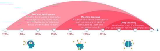 Although traditional ML methods such as SVM [,,], Bayesian networks [], and the Kalman filter (KF) [,] were used in early ITS research [], the problem-solving capabilities of algorithms have improved over time due to the development of hardware resources and the increasing amount of training data. As can be seen in Figure 2, while the concept of ML was dominant in the years between 1980 and 2010 [], it was observed that these classical ML algorithms had difficulties processing large amounts of data; in response, artificial neural network (ANN)-based models began to emerge. However, since classical ANN models are insufficient for processing big data, modern ANN structures have been developed, which led to the development of DL models. While models that extract features from images and those that perform classification using these features are separate in ML algorithms, DL models can perform both processes in a single artificial neural stack.