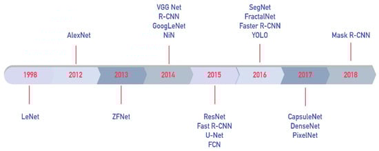 Variants of CNN networks are widely used in CV studies in the field of ITS. There are a number of CNN-based studies in the literature, such as those focused on automatic license plate recognition [,], traffic sign detection and recognition [,,,,,,,,,,], vehicle detection [,,,], pedestrian detection [,,,,], lane line detection [,,], obstacle detection [], video anomaly detection [,,,], structural damage detection [,,,,,,,,,], and steering angle detection [,,,] in autonomous vehicles. The most popular and advanced CNN-based architectures in the literature [,] are presented in Figure 3.