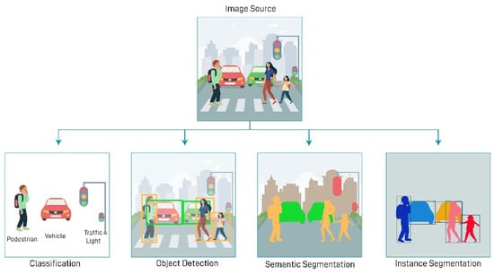 Among the data emerging in the field of ITS, visual data are among the most voluminous kind. CV studies enable the analysis of both images and videos and provide detailed information about the traffic situation. Figure 4 presents some of the basic functions performed by CV techniques in the field of ITS. As can be seen from the figure, CV methods play a significant role in performing basic functions such as (i) classification, (ii) object detection, (iii) semantic segmentation, and (iv) instance segmentation [].
