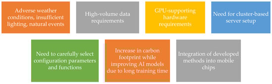 Research into the use of CV methods in road transport systems was presented in [] and [], while a comprehensive review of traditional CV techniques for traffic analysis systems with a particular focus on urban environments was presented in []. However, those studies lack the state-of-the-art CV methods developed within the last decade. ML techniques have been used effectively to make transportation systems more efficient, especially in recent years, in. In current research, it has been noted that traditional ML models are now being replaced by new learning techniques and that DL techniques are widely used in ITS. A comprehensive study focusing on the use of DL models to increase the intelligence of transportation systems was presented by Wang et al. in []. Authors explored the use of DL models in various transportation applications including (i) traffic sign recognition, (ii) traffic flow prediction, (iii) traffic speed prediction, and (iv) travel time prediction. Applicability and shortcomings of DL models in the context of ITS and evolving future trends were also argued.