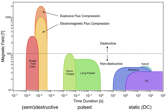 Figure 1. Overview of high magnetic field generation methods depending on amplitude and duration. (SC stands for Superconducting). Reprinted with permission from [13]. © 2018 Elsevier B.V.