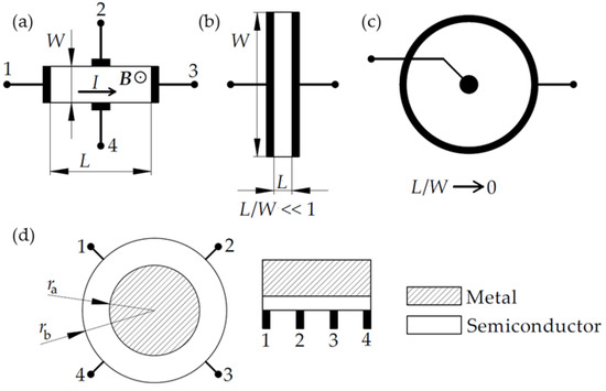 For magnetoresistance measurements, the Hall voltage must be minimized. In this case, the sample with electrodes has to be short and wide, i.e., the distance between electrodes L has to be much smaller in comparison with the width of the sample W: L/W << 1 (see Figure 2b). This condition is satisfied for Corbino disc geometry (Figure 2c) which gives the highest physical magnetoresistance values because the Hall electric field is shorted, and VH = 0. However, the Corbino disc geometry is inconvenient for device fabrication. Instead, the short and wide rectangular-shaped structures with L/W < 0.4 [24,26] could be used. For example, the Field-effect transistor (FET) configuration satisfies the requirement L/W << 1 well and is generally used in the magnetoresistance and MR mobility measurements (see, for example [27]).