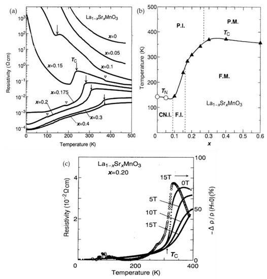 where R rare-earth cation, A alkali or alkaline earth cation) have been widely studied starting from the investigations of La1−xCaxMnO3 materials in the late 1940s performed at Philips research laboratories by Jonker and van Santen [34,35,36]. In these publications, the preparation of polycrystalline ceramic samples as well as investigations of their structural, electrical conductivity and magnetic properties were presented and discussed. A negative magnetoresistance in another lanthanum manganite—La0.8Sr0.2MnO3 obtaining the highest values close to the Curie temperature, was first presented and discussed by Volger [37]. The observation of the so-called “colossal” magnetoresistance (CMR) effect in the 1990s [38,39] on thin high-quality epitaxial films of doped manganites has again stimulated investigations of their properties. It was found that the CMR at room temperatures can be much larger (~60% at 5 T, normalizing the resistivity change to the zero-field value) [39] in comparison with multilayer structures of ferromagnetic/nonmagnetic materials [40], which were proposed for use in magnetic recording. The magnetoresistance (MR) is usually defined by Equation 1, therefore, for manganites it is negative, because the resistivity decreases with applied magnetic field. Figure 3 presents typical characteristics of one of the mostly investigated lanthanum manganite La1−xSrxMnO3 crystals with different chemical composition (0 ≤ x ≤ 0.6) [41]. Resistivity vs. temperature dependences reveal the insulator–metal transition (Figure 3a) which is not observed for x ≤ 0.05. The ferromagnetic–paramagnetic phase transition temperature (Curie temperature, TC, indicated by arrows) almost coincides with the metal–insulator transition temperature, TM-I, corresponding to a maximal resistivity ρm in ρ vs. T dependence. An electronic phase diagram is presented in Figure 3b showing different possible phases of this material. Figure 3c presents resistivity vs. temperature dependences at different applied magnetic fields and magnetoresistance at 15 T. One can see that the highest MR values are obtained in the phase transition region close to TC.