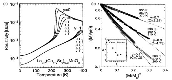 Figure 4. (a) Resistivity vs. temperature dependences for La0.7(Ca1−ySry)0.3MnO3 crystals with different chemical compositions. The observed MR at y = 0 is much stronger in comparison to y = 1; and (b) normalized resistivity represented on logarithmic scale as a function of the square of reduced magnetization for y = 0.1, 0.3, and 0.7. The inset shows the variation of a slope of this plot (constant C) with change of y. Reprinted with permission from [42], ©1995 American Physical Society.