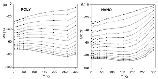 Figure 5. Temperature dependences of magnetoresistance for poly- (a); and nanocrystalline (b) manganites La0.8Sr0.2MnO3 upon applied different magnetic fields: 1, 2, 4, 6, 8, 10, 12, 15, 20, 25, 30, 35, 40, 45, and 47 T (from top to bottom). Reprinted with permission from [54]. Copyright 2015 AIP Publishing.