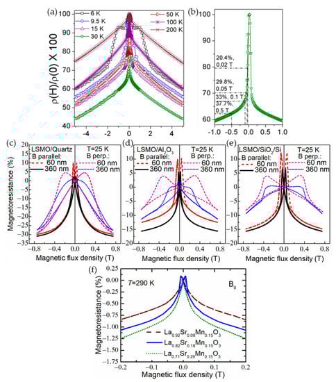 Figure 7. Normalized resistance as a function of applied field at different temperatures (a); and low-field magnetoresistance at 30 K (b) for La0.71Sr0.29MnO3 nanoparticles synthesized by nonaqueous sol–gel route. Reprinted with permission from [67], copyright 2014 American Chemical Society; (ce) Low-field magnetoresistance dependences on magnetic flux density for different thickness films (60 nm and 360 nm) grown on different substrates. Measurements performed at ambient temperature of 25 K. Reprinted from [68], copyright 2022 MDPI; and (f) MR vs. magnetic field dependences at room temperature for nanostructured La1−xSrxMnyO3 films with different Sr content x and constant Mn excess y = 1.15. Reprinted from [69], copyright 2022 MDPI.