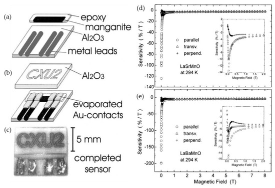 Figure 10. (ac) Schematic drawing of LaBaMnO bulk sensor; (d,e) field sensitivity dependence on magnetic field applied in different directions (parallel, transverse and perpendicular) for LaSrMnO (upper panel) and LaBaMnO films (lower panel). Reprinted with permission from [80], copyright 2001 Elsevier.