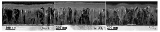 Figure 11. TEM images of nanostructured La-Sr-Mn-O films grown on quartz, polycrystalline Al2O3 and amorphous SiO2/Si substrates. Reprinted from [68], copyright 2022 MDPI.