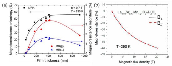Figure 12. (a) The dependences magnetoresistance anisotropy MRA (left scale) and magnetoresistance MR in perpendicular (⊥) and parallel (||) to film plane field directions (right scale) on thickness of La0.17Sr0.83MnO3 films grown on glass ceramics substrate. Reprinted with permission from [56]. Copyright 2018 Springer; and (b) magnetoresistance dependences on magnetic flux density for La0.17Sr0.83Mn1.21O3 film grown on polycrystalline Al2O3, when the magnetic field was applied parallel and perpendicular to film plane. Reprinted from [68]. Copyright 2022 MDPI.